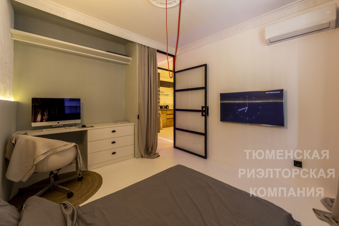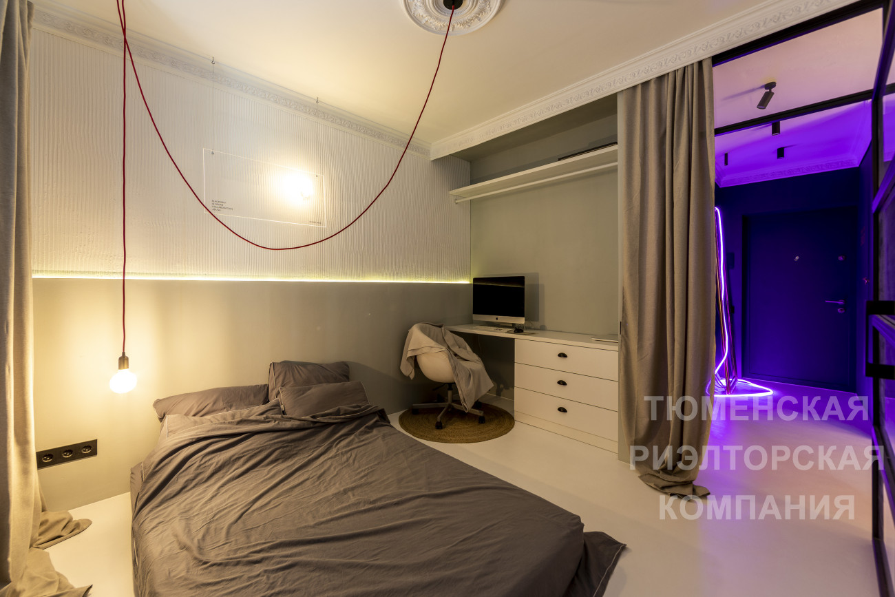 - Квартира оборудована качественной мебелью, включая уютную спальную зону, функциональную гостиную, спальню и рабочий уголок.