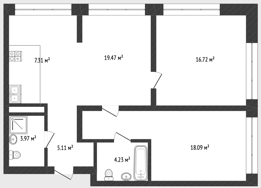 Квартира формата 2+ с возможностью перепланировки в полноценную трехкомнатную квартиру, предчистовая отделка. Срок сдачи 1 кв 2026 года, 6 месяцев на выдачу ключей.